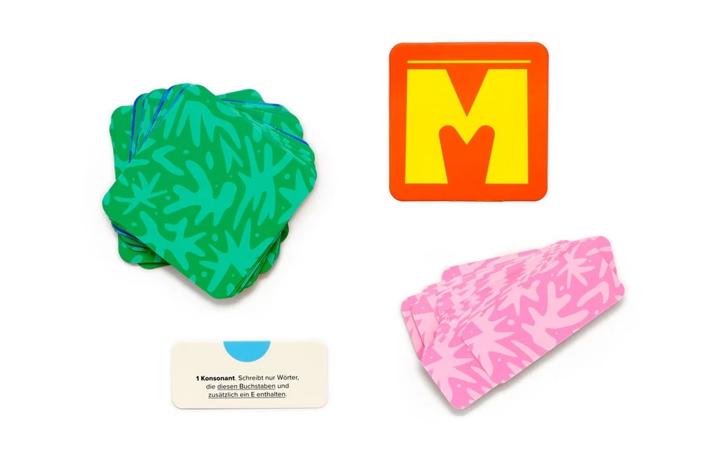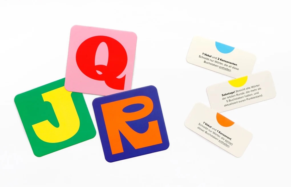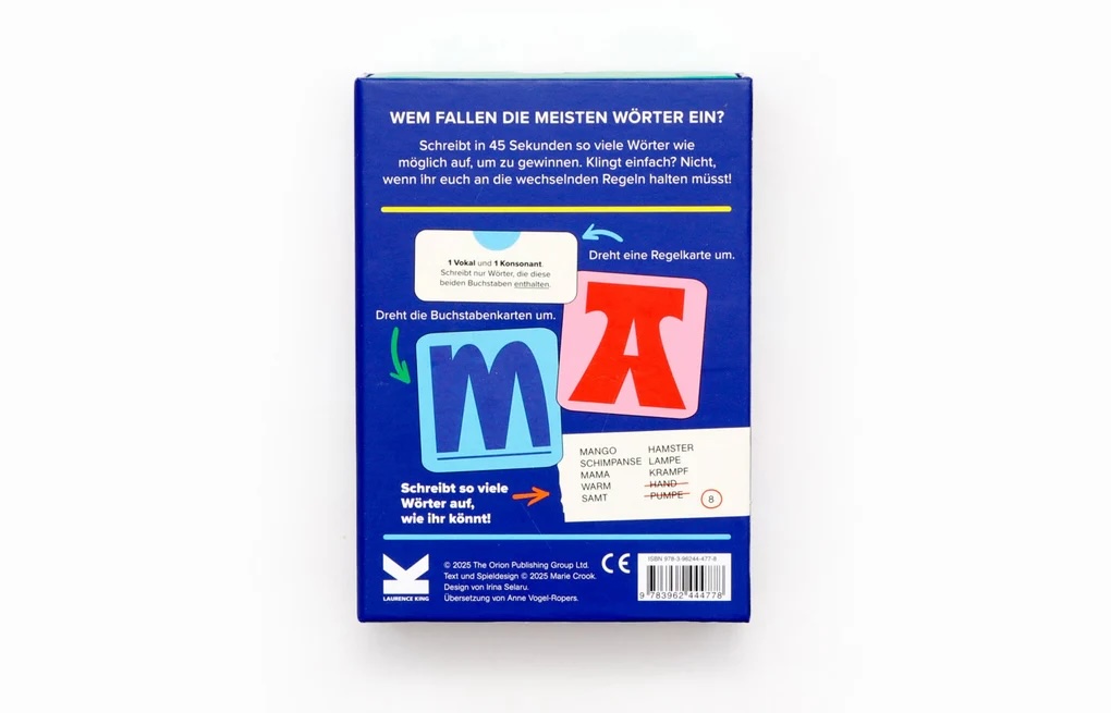 Wem fallen die meisten Wörter ein? Alle schreiben in 45 Sekunden so viele Wörter auf, wie ihnen einfallen. Klingt einfach? Nicht, wenn man sich an die wechselnden Regeln halten muss! In jeder Runde werden eine Regelkarte und die entsprechenden Buchstabenkarten aufgedeckt, und dann schreiben alle unter Berücksichtigung der Regel so schnell wie möglich so viele Wörter wie möglich auf. Auf die Stifte, fertig, los!