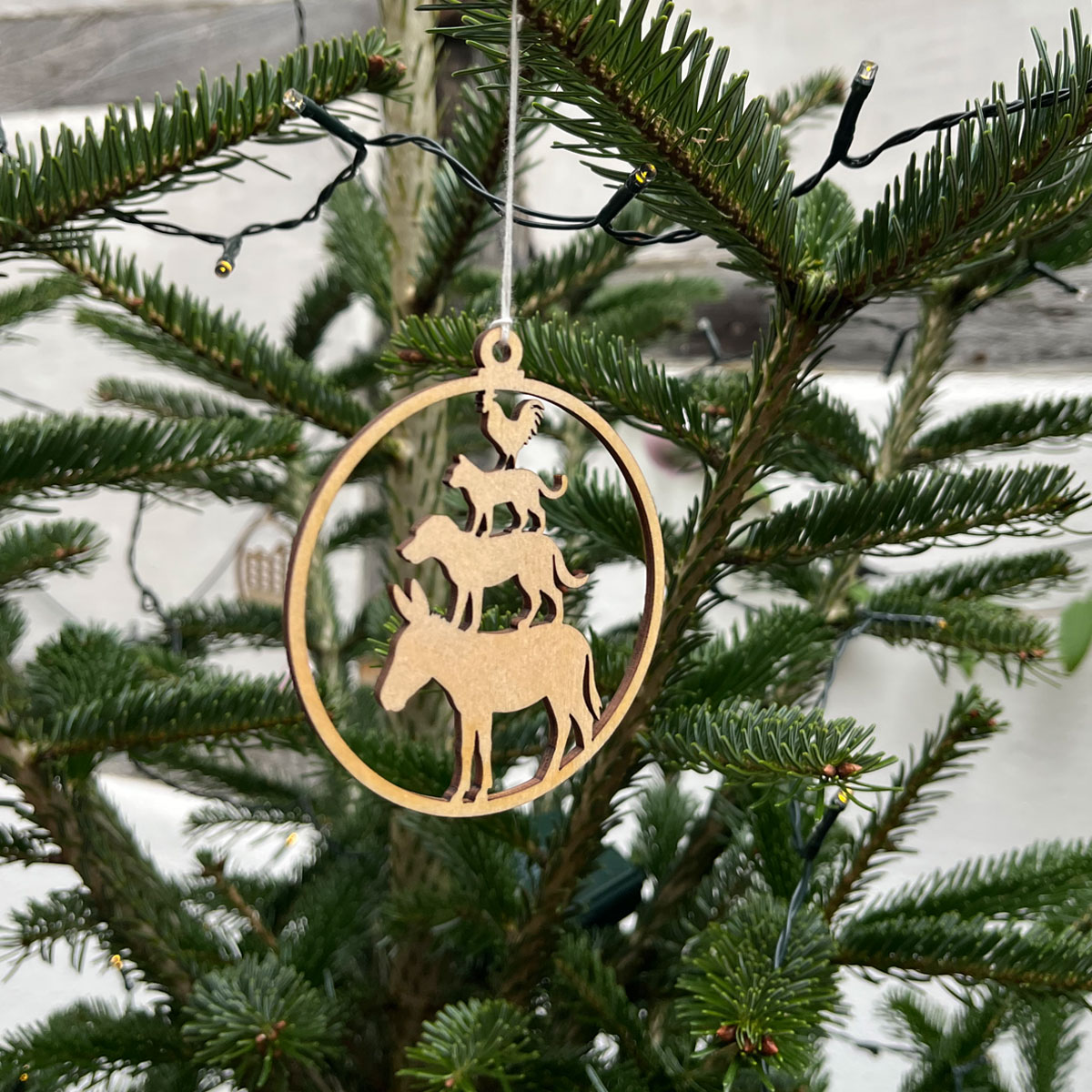 Für Märchen-Fans und Designliebhaber: Unser filigraner Baumschmuck zeigt das ikonische Motiv der Bremer Stadtmusikanten und verbindet modernes Design mit der natürlichen Schönheit von hellem Birkenholz. Hol Dir Märchenzauber und nordische Eleganz in Deine Weihnachtsdekoration.