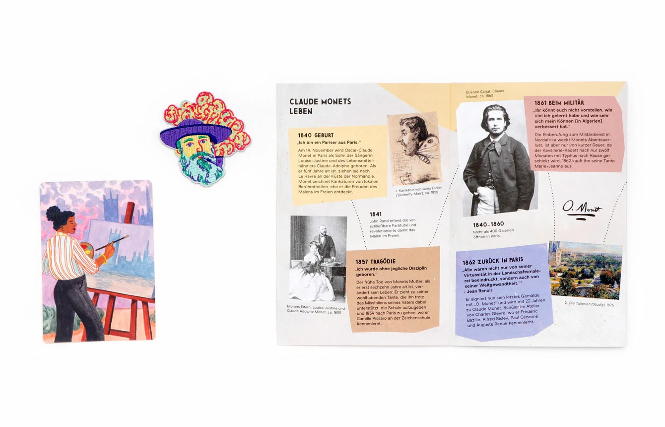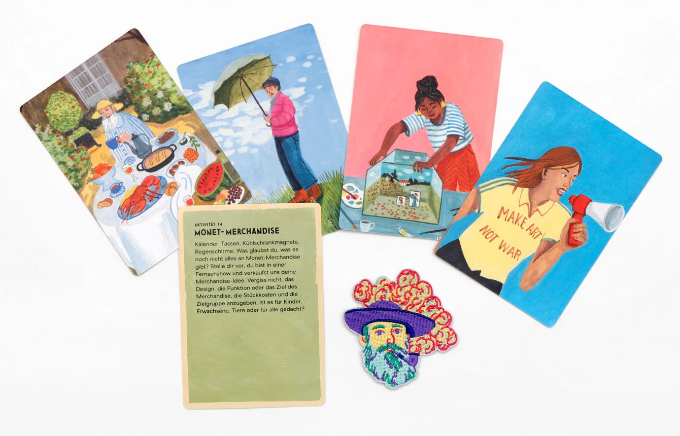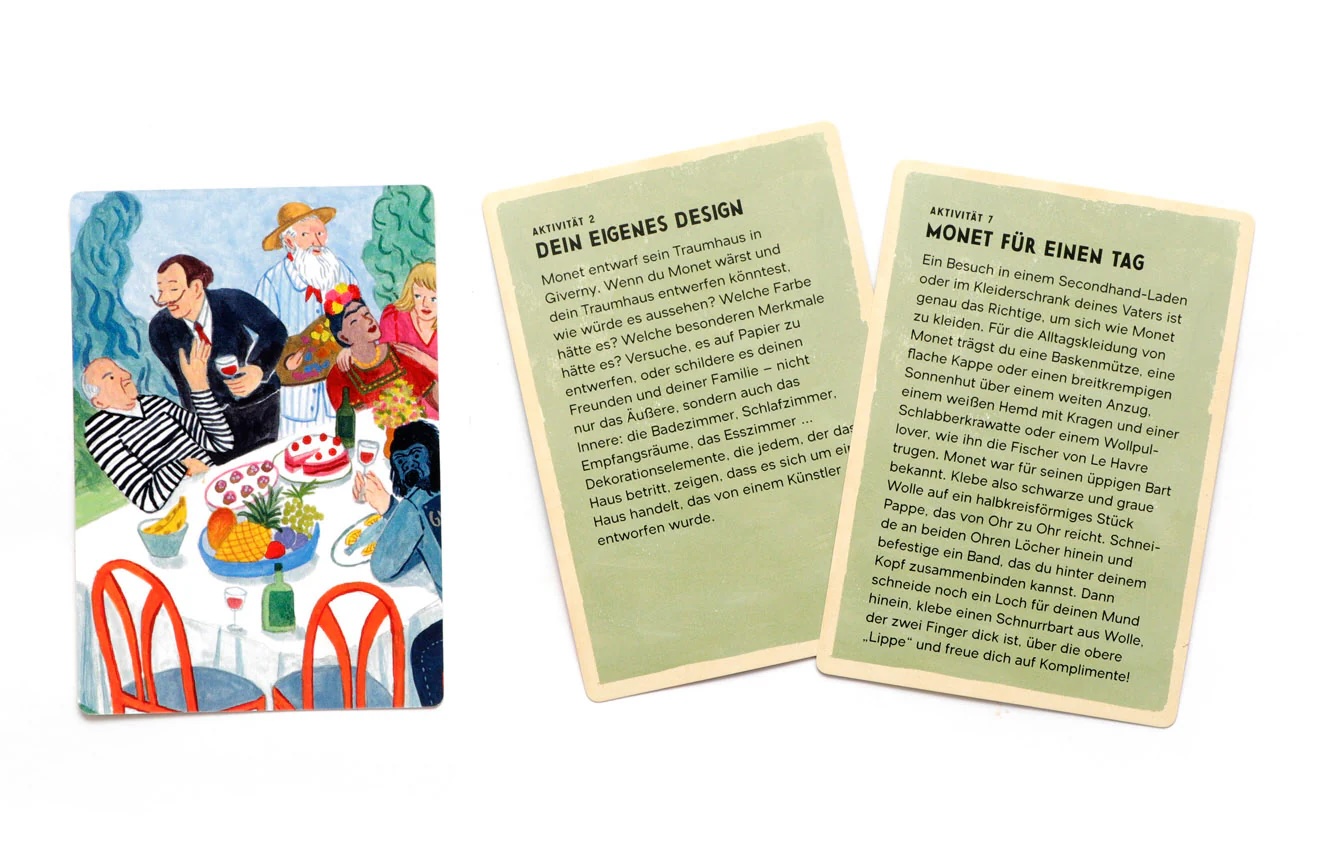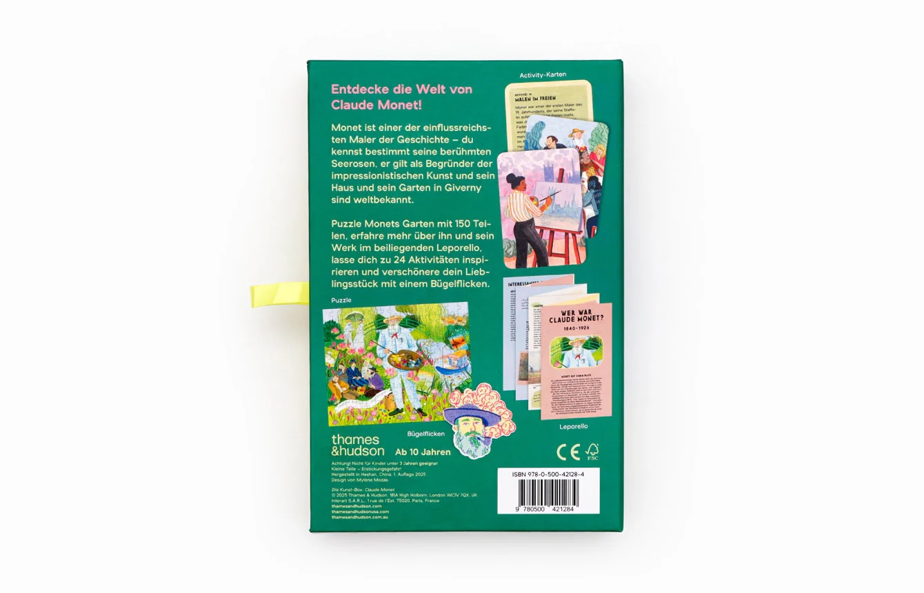 Feier einen der einflussreichsten Künstler und lass dich von den 24 Karten zu verschiedenen Aktivitäten inspirieren! Erschaffe deine eigenen Monet-Motive, bastle Seerosen mit Origami oder entschlüssele ein Rätsel. Du kannst auch das 150-Teile-Puzzle zusammensetzen, dabei andere Impressionist*innen kennenlernen und Monets Frau Camille sowie Details aus fünf seiner wichtigsten Gemälde erkunden. Ein Leaflet liefert dazu umfassendes Hintergrundwissen. Entdecke die Schönheit der Welt durch Monets Augen!