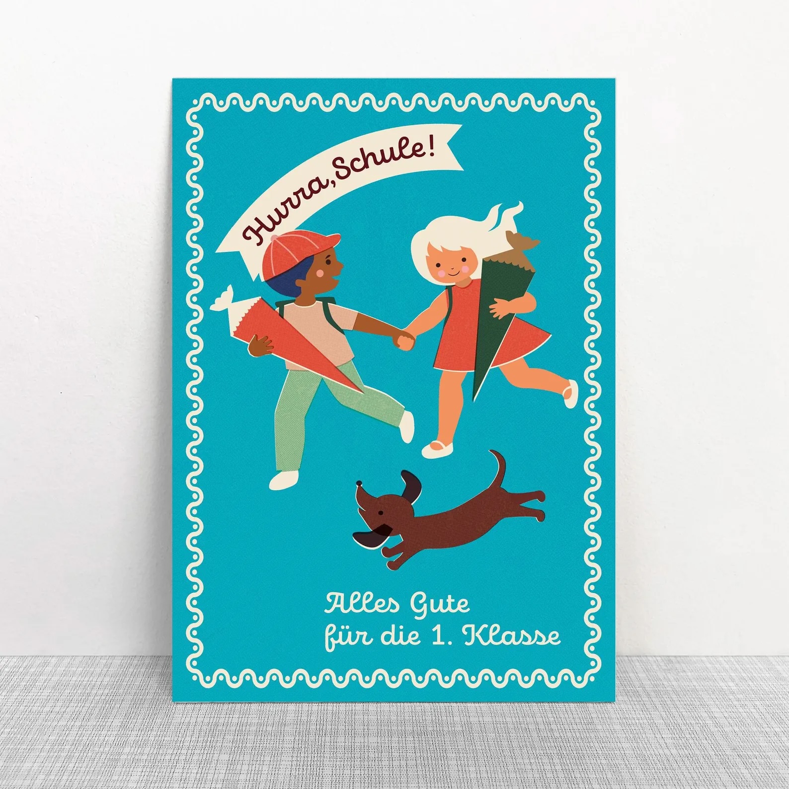 Hurra Schule – Postkarte mit Kindern mit Schultüte auf dem Schulweg von MONIMARI für jedes Alter. Eine wundervolle Karte zur Einschulung. Schenke Freude und schreibe.