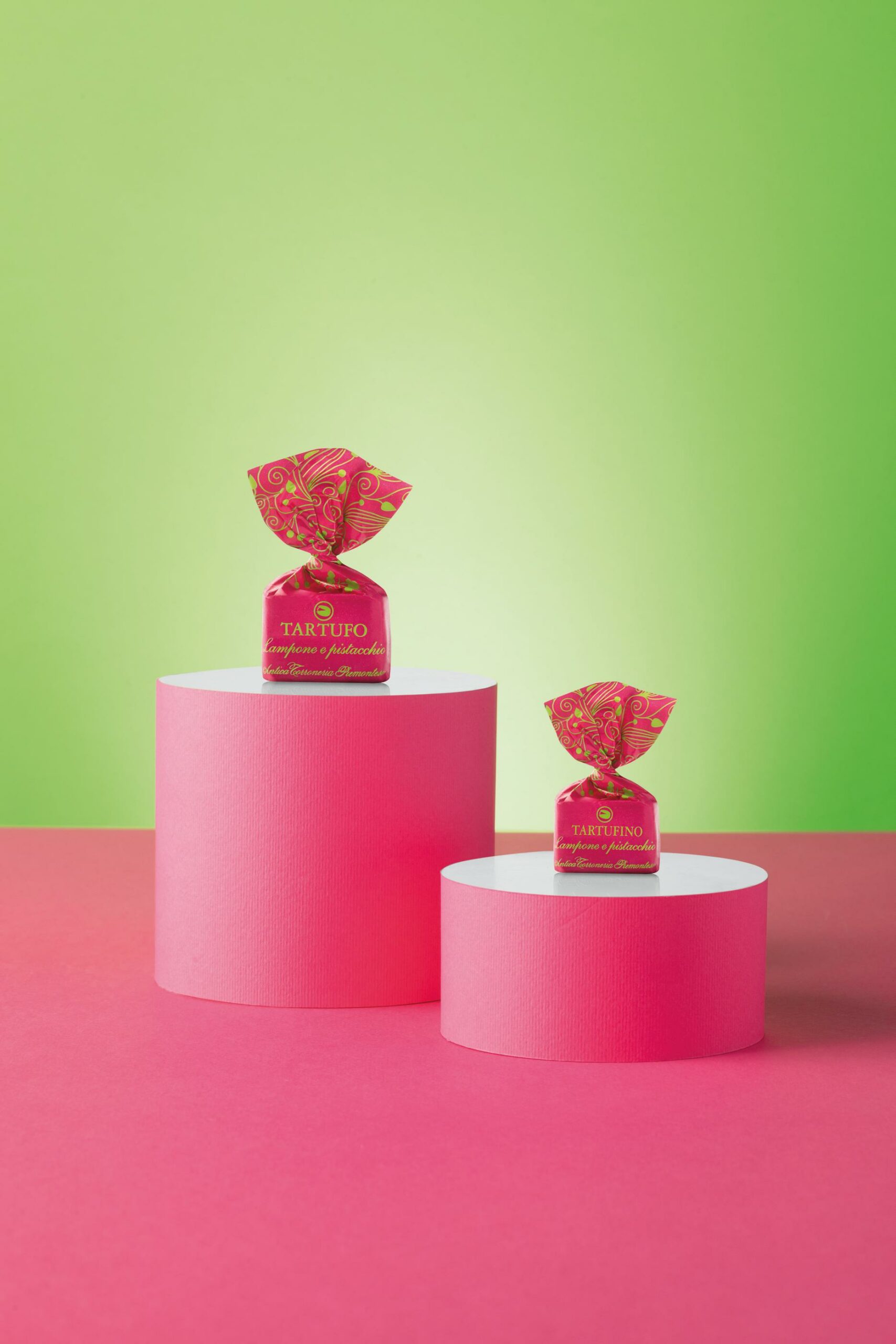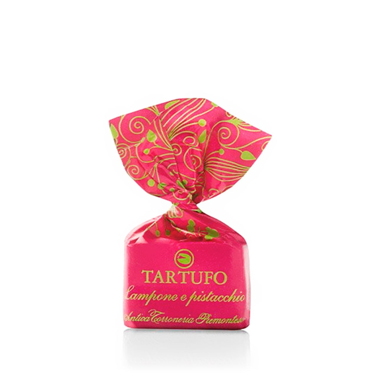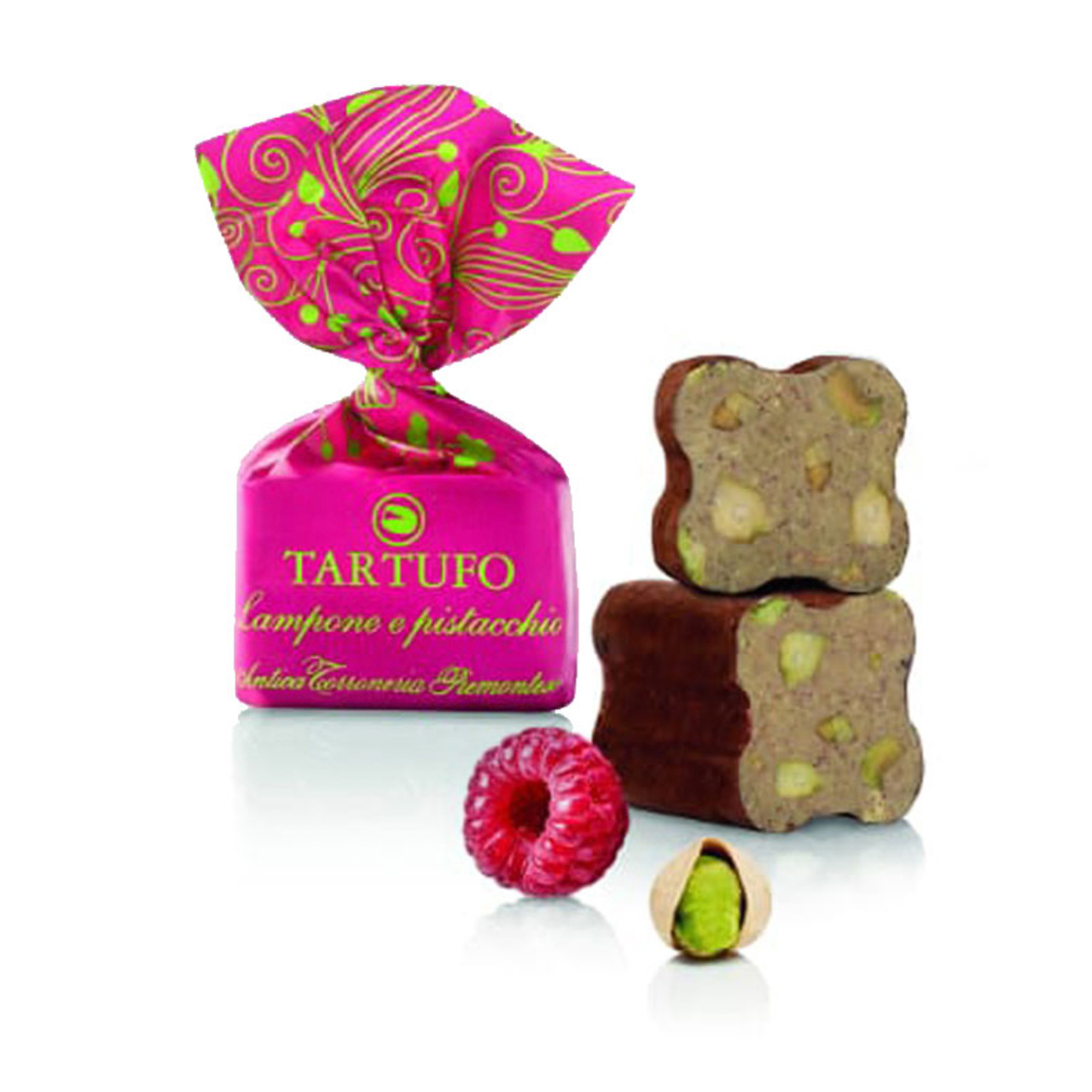 Schokotrüffel mit Pistazien und Himbeere – eine Creme aus weißer Schokolade und Pistazien in Verbindung mit Himbeeren machen diese Tartufi- Sorte zu einem unvergleichlichen Geschmackserlebnis.