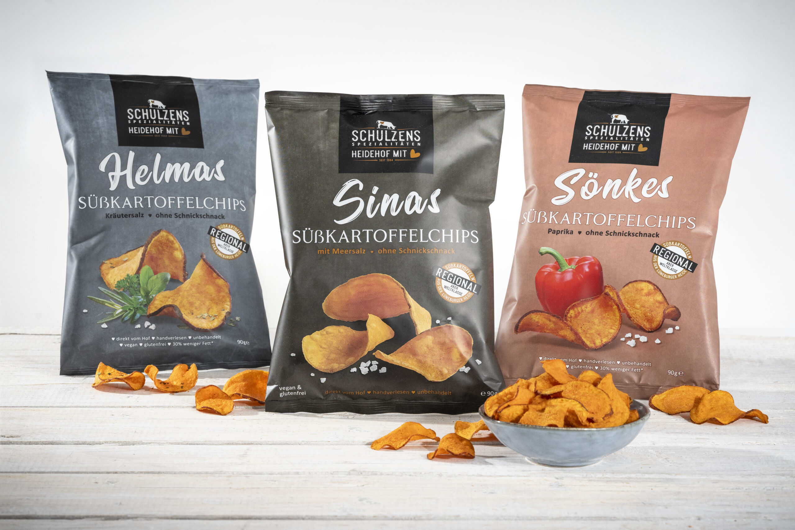 Aus der Lüneburger Heide und unfassbar lecker: SCHULZENS SÜSSKARTOFFELCHIPS! Ehrliche, transparente Produktion ohne Schnickschnack. Lediglich eine Handvoll natürliche Zutaten machen den Biss zu einem echten Erlebnis. Knackig und dennoch zart, eine harmonische Ergänzung aus zwei Welten: Die fruchtige Süßkartoffelnote gepaart mit leckeren Gewürzen – ein echter Genuss.