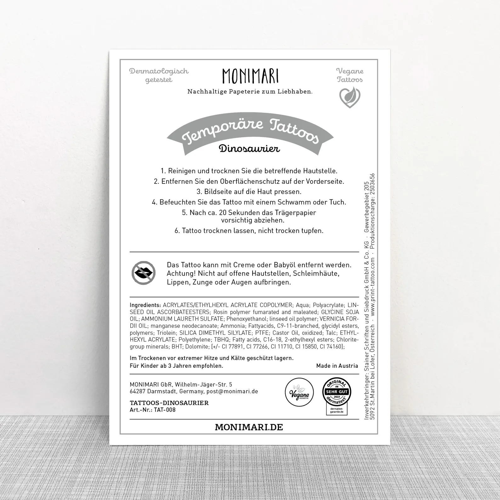 | Lieferumfang | 1x Tattoos "Dinosaurier" von Monimari Achtung: Karten und Deko sind nicht im Lieferumfang enthalten. |