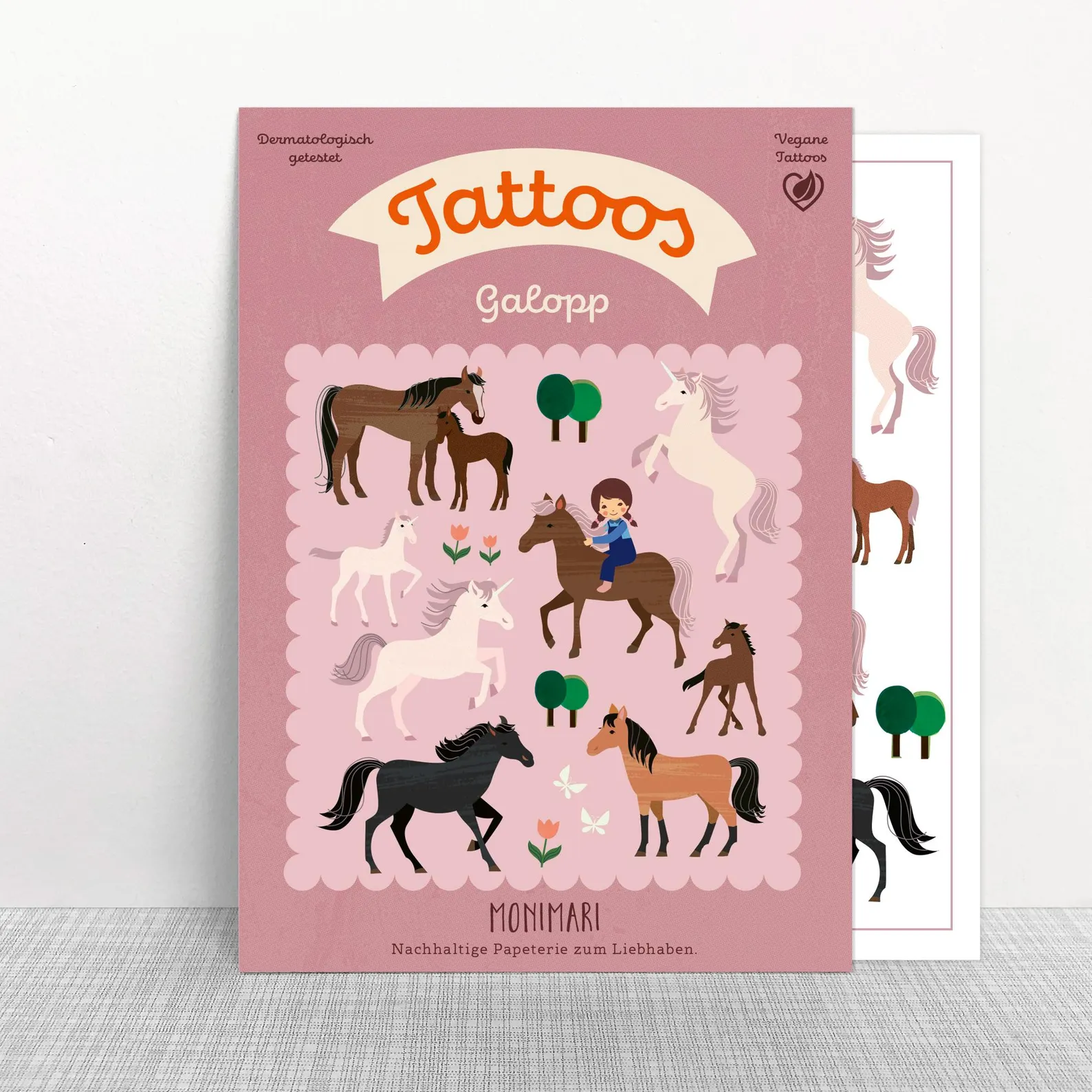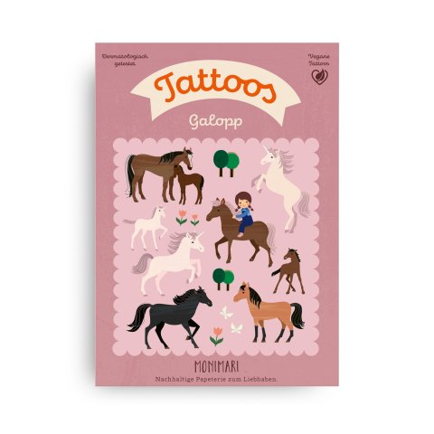 Endlich Schulkind! Da haben wir das perfekt Geschenk für die Schultüte. Tattoobogen für Kinder mit vielen schönen und coolen Pferde Motiven. Diese temporären Tattoos von Monimari zeigen wunderschöne Illustrationen mit Pferden.