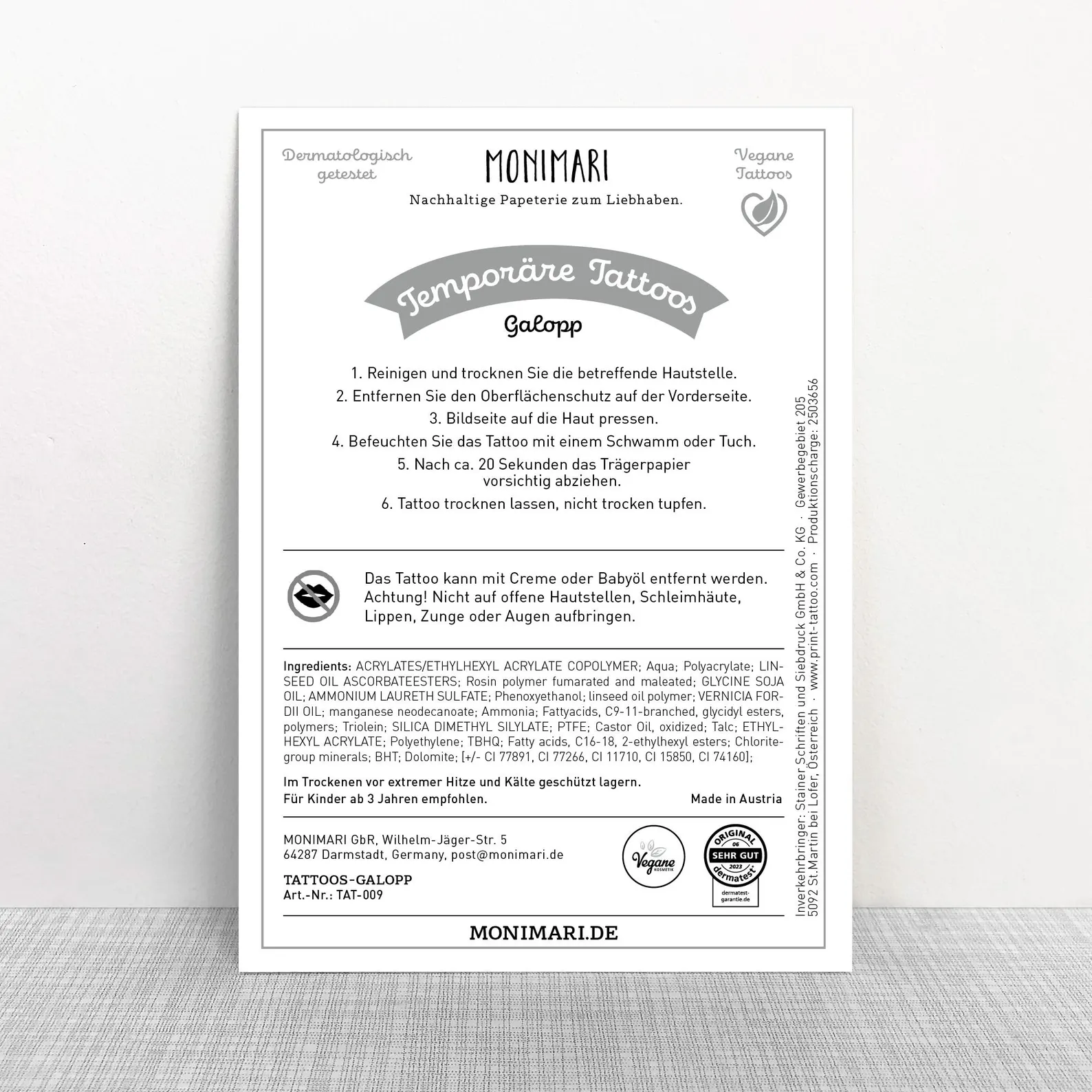 1 Bogen in DIN C6 Umschlag, dermatologisch getestet, Wassertransfer-Tattoos, 100% vegan, umweltfreundliche Verpackung aus Papier, klimaneutral, keine Plastik-Schutzfolie, hergestellt in Österreich, leichtes Entfernen mit Creme oder Babyöl. In schöner Umverpackung (Umschlag) aus Recyclingpapier.